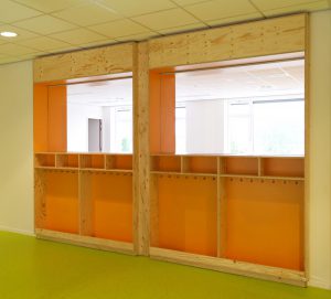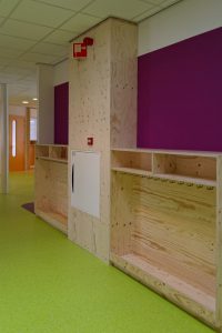 De frisse kleuren oranje, paars en groen vormen een mooie balans met het Fins vuren waaruit de gardobemeubels zijn vervaardigd. De speciale combinatie van onderkast en geïsoleerde tussenwand zorgt ervoor dat een aantal van de garderobemeubels dienst doen als scheidingswand tussen gangzijde en lokaal. In totaal werden 21 opstellingen geplaats in verschillende opstellingen en maatvoeringen, waarbij de meubels aan de gangzijde voorzien zijn van garderobehaken. De meubels aan lokaalzijde zijn voorzien van open opbergvakken en vakken geschikt voor standaard (opberg)lades. Ontdek meer over het Hip2School concept van Hermeta Interieurbouw.