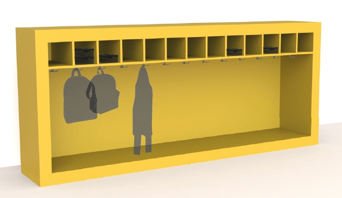 Het basiselement van HIP2School is dubbelzijdig inzetbaar, waarmee een speciale combinatie van onderkast en geïsoleerde tussenwand ervoor zorgt dat het garderobemeubel kan dienen als scheidingswand tussen gangzijde en lokaal.