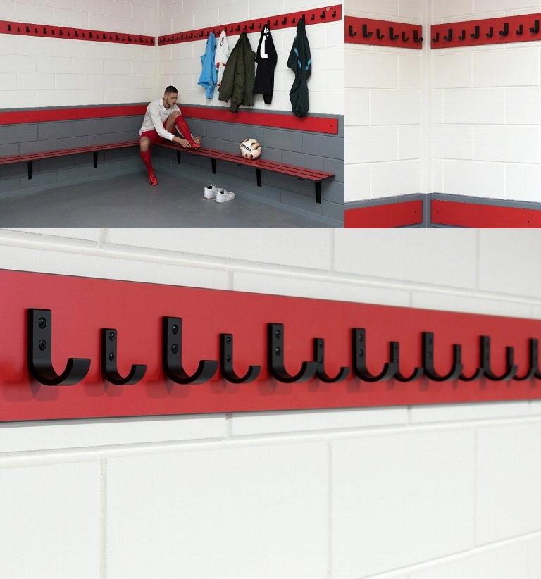 Speciaal voor de nieuwe kleedkamers ontwikkelde Hermeta Projectbouw strakke smetplanken in een kenmerkende rode clubkleur. Speciale aandacht voor de kleinste details is vanzelfsprekend voor Hermeta. De smetplanken zijn daarom voorzien van ingefreesde logo’s. Hermeta Metaalwaren leverde ruim 700 moderne jashaken in een matzwarte finish. Deze geven de kleedruimtes een eigentijds en sportief karakter. Het initiatief en de uiteindelijke verwerking kwam voort uit collega’s van Hermeta Gevelbouw, die als clublid én Hermetiaan de elementen vakkundig gemonteerd hebben. Een teamprestatie waar we trots op zijn!