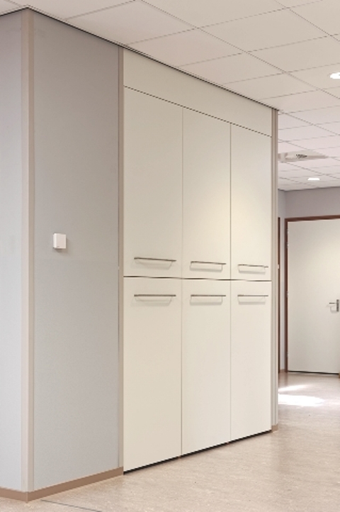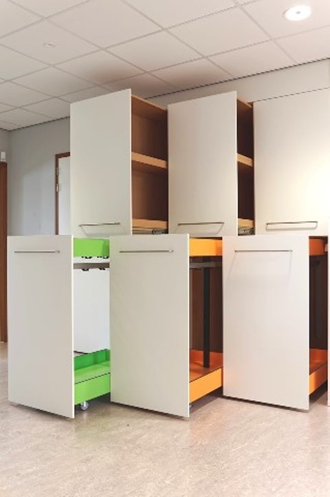 De garderobe-nissen zijn geheel op maat gemaakt en passen perfect in het gebouw. Elke nis bestaat uit twee delen, waarvan het bovenste gedeelte uitschuifbaar is en gebruikt kan worden als archiefkast. Het onderste gedeelte van de nis dient als opbergruimte voor verrijdbare garderoberekken.