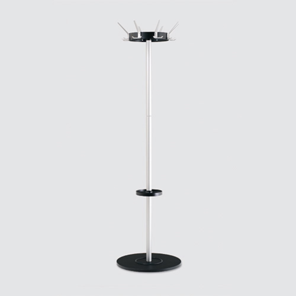 Staande kapstok met 8 haken en paraplustandaard, ronde kroon van gegoten aluminium, hoogte 1800 mm.