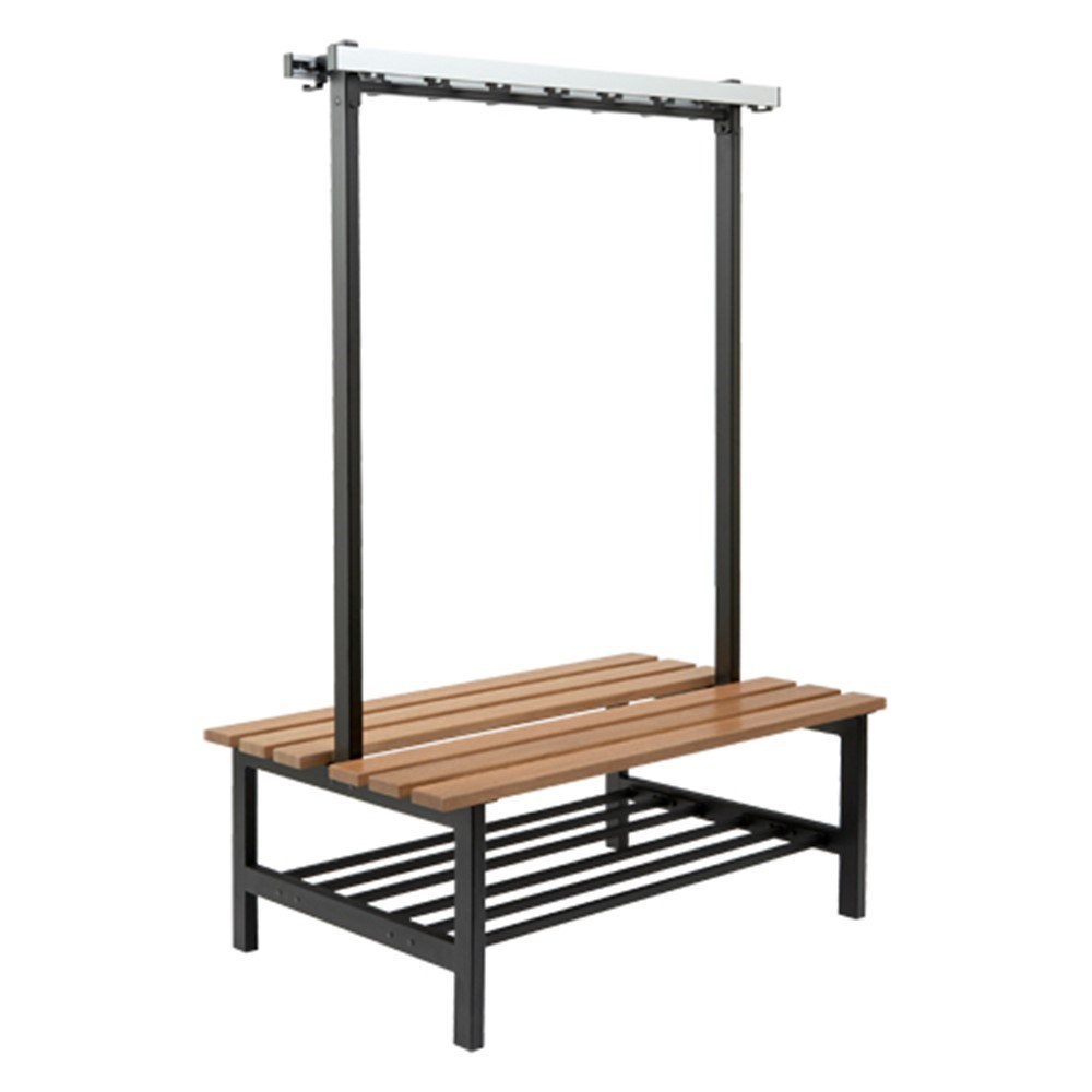Met houten zitdelen en schoenenrek.
